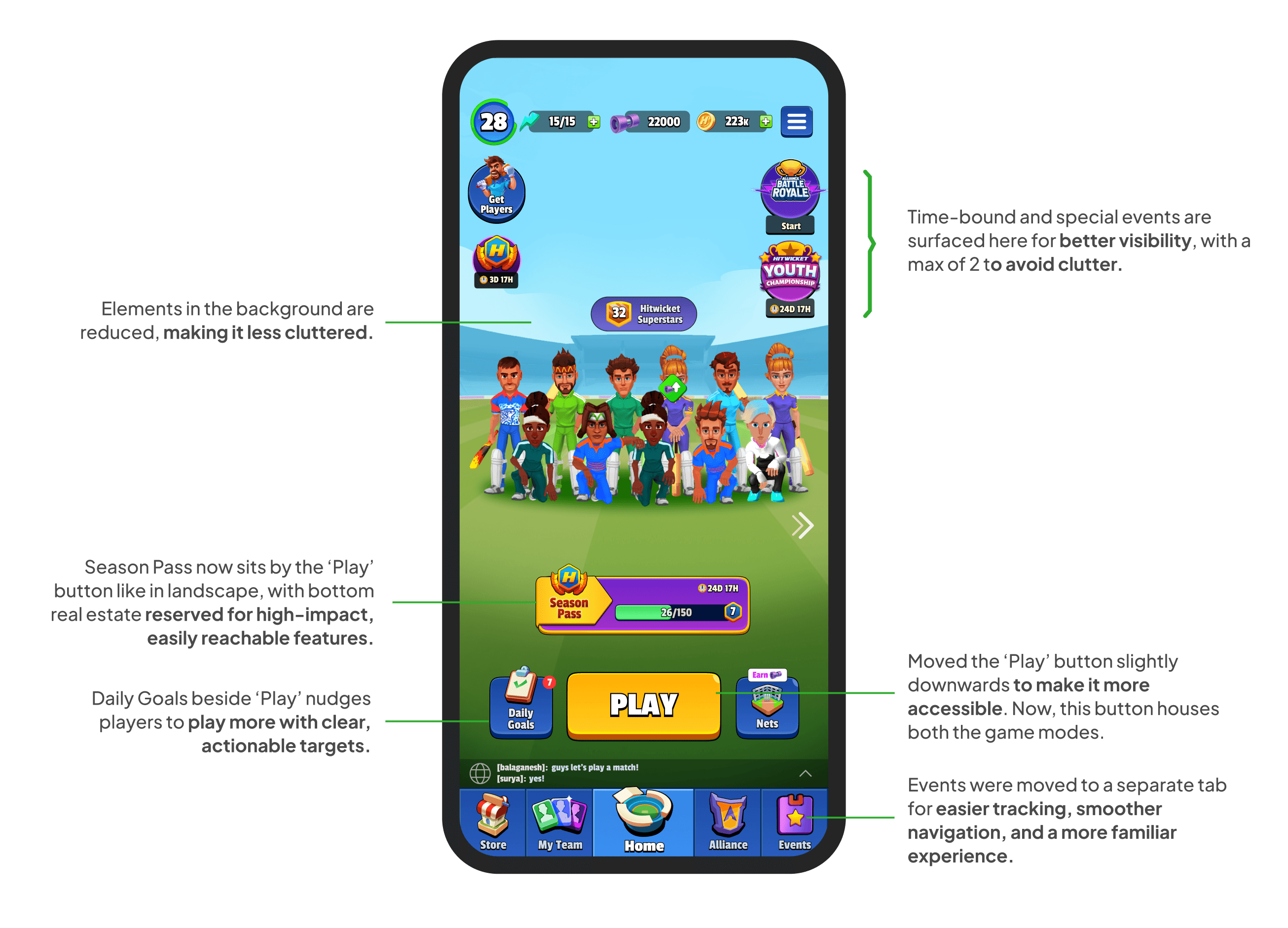 Our team transitioned Hitwicket from landscape to portrait mode to improve early user retention. As the lead designer on this initiative, I primarily owned the Home Page redesign.